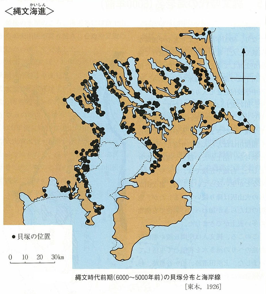 고야마씨가 이런 바보 나막신 추계를 하는 것은, 지금부터 5000∼6000앞에 일어난 「縄文海進」(승문해신)이라고 하는 현상, 다시 말해 이 1000년 정도는 전 지구적으로 온난화가 염려되는 현재보다도 더욱 온난해서, 바닷물면이 현재보다도 몇미터 높이, 관동지구에서는 평야가 깊숙하고, 지바·사이타마·이바라기·군마·도치기의 현경계당까지 바다가 억지로 들어가 있었다.