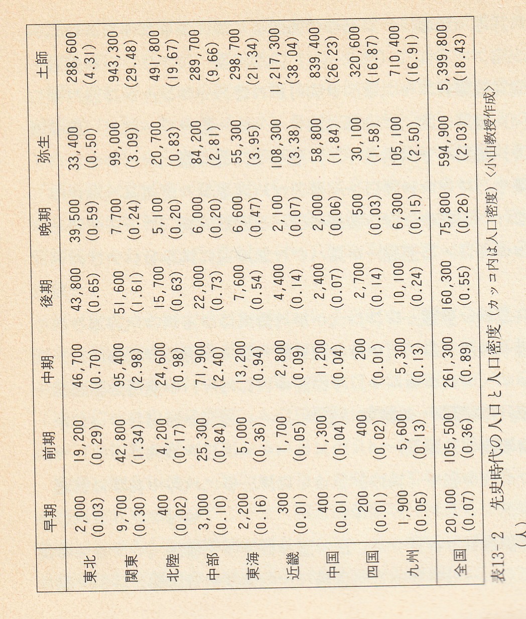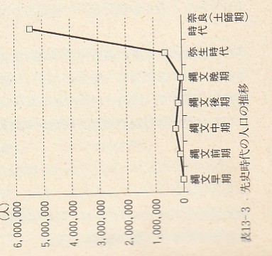 오른쪽의 표와 도는, 예의 고야마 슈조씨에 의한 승문시대와 야요이시대∼나라 시대에 걸쳐서의 인구추계이며, 고야마씨는 승문시대말기의 인구는 약 7만5000, 그것이 야요이시대에 들어가면 곧 약 60만에 증가, 그로부터 700년후의 정부에 의한 인구 통계가 있는 나라 시대 초기(AD600년대 후반)에는 540만까지 늘어났다고 하고 있다.